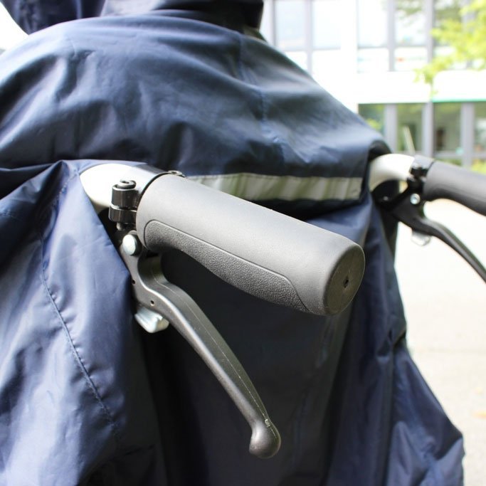 Regnponcho designad för rullstol som håller dig torr och varm. Ponchon är tillverkad i blått vattentätt polyestermaterial och har foder i mjuk bomull. Den har en längre dragkedja som kan öppnas både från in- och utsidan samt band och tryckknappar som håller den på plats vid blåst.