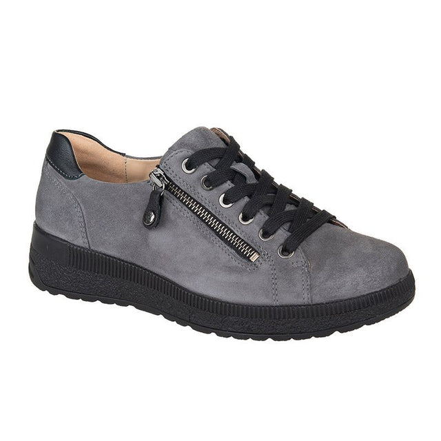 Fin damsko i grå mocka med rund tå, snören och dragkedja. Skon är lätt att justera och enkel att ta av och på.