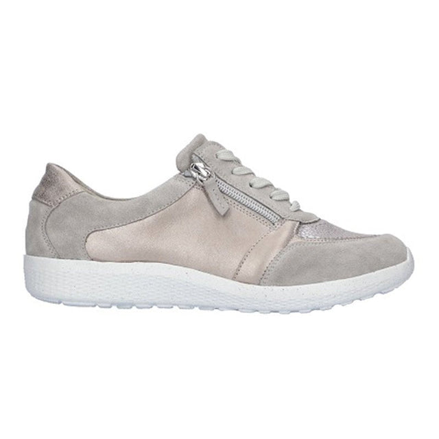 Snygg och superkomfortabel sko från Waldläufer i ljusgrå toner med en ovandel av slätt skinn, mocka och elastiskt textil som ger plats för exempelvis knölar. Skon justeras med snörning och stängs med dragkedja.