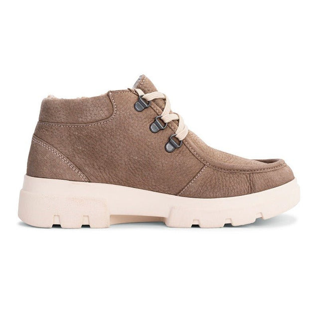 Ljusbrun damkänga i nubuck med en elegant mockasin-söm. Kängan är fodrad med varm, mjuk ull och har praktiska skosnören som gör den enkel att justera.