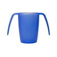 Mugg med 2 öppna handtag i blå plast. Handtagen passar till både små och stora händer och ger ett stadigt grepp.