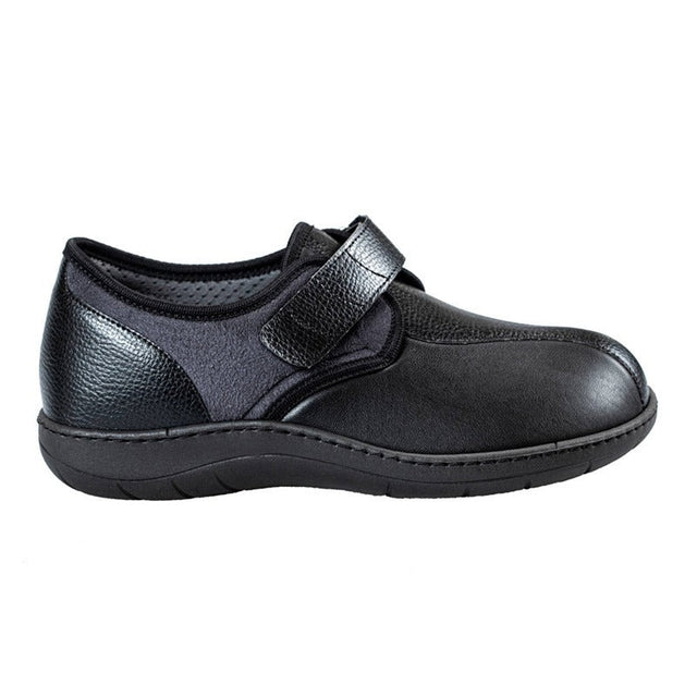 Bred, flexibel specialsko från det italienska märket Extrostyle med justerbar kardborrerem. Med sin fasta hälkappa och flexibla överdel sitter den ordentligt och formar sig efter foten. Den här modellen är designad till personer med svullna och ömma fötter, knutor eller andra fotskavanker.