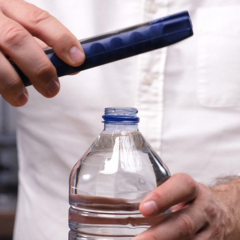 Öppnaren är otroligt användarvänlig och du behöver inte vara stark i händerna för att kunna använda den. Kläm fast hållaren runt locket i en av de fyra greppen, kläm lätt och vrid av locket.