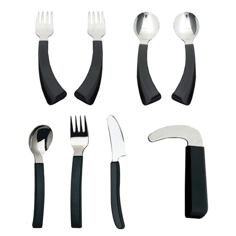 Bestick med ergonomisk utformning som gör det enklare att föra sked och gaffel till munnen. Dessa bestick är särskilt lämpliga om du har nedsatt styrka i händer, handleder och armar eller om du har smärtor eller problem att böja handleden.