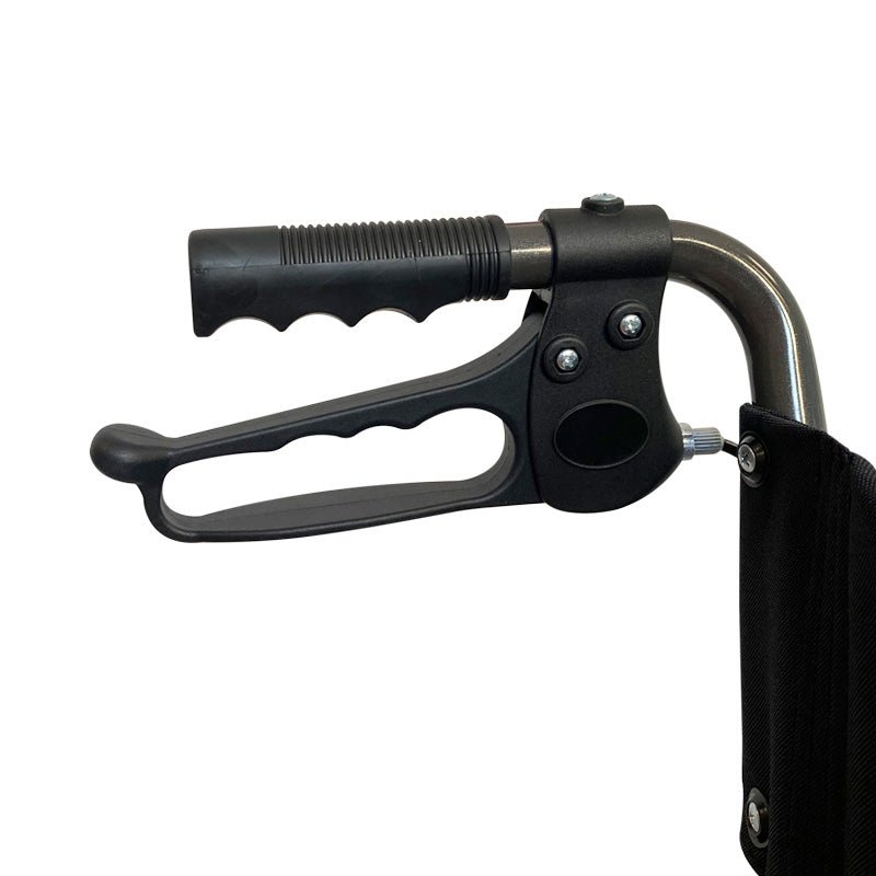 Genom att dra i de två handtagen på sidorna av sitsen fälls rullstolen snabbt ihop. Dessutom kan ryggstödet fällas ned till hälften och fotstöden monteras av, vilket sammantaget gör att rullstolen inte tar mycket plats . Handtagen kan sedan användas till att lyfta och bära den hopfällda rullstolen.