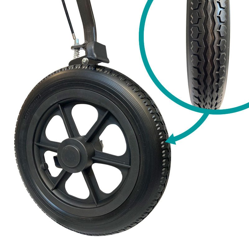 Rullstolen har 4 mm tjock skumpolstrad sits och ryggstöd, magbälte med klicklås och avtagbara/justerbara fotstöd, vilket gör den ytterst bekväm och säker för användaren. Handtagen är ergonomiska och utrustade med lättillgängliga bromsgrepp. På innersidan av båda bakhjulen sitter fastmonterade tippedaler så att en assistent enkelt kan forcera kantstenar eller andra mindre hinder. Samtliga fyra däck är punkteringsfria.