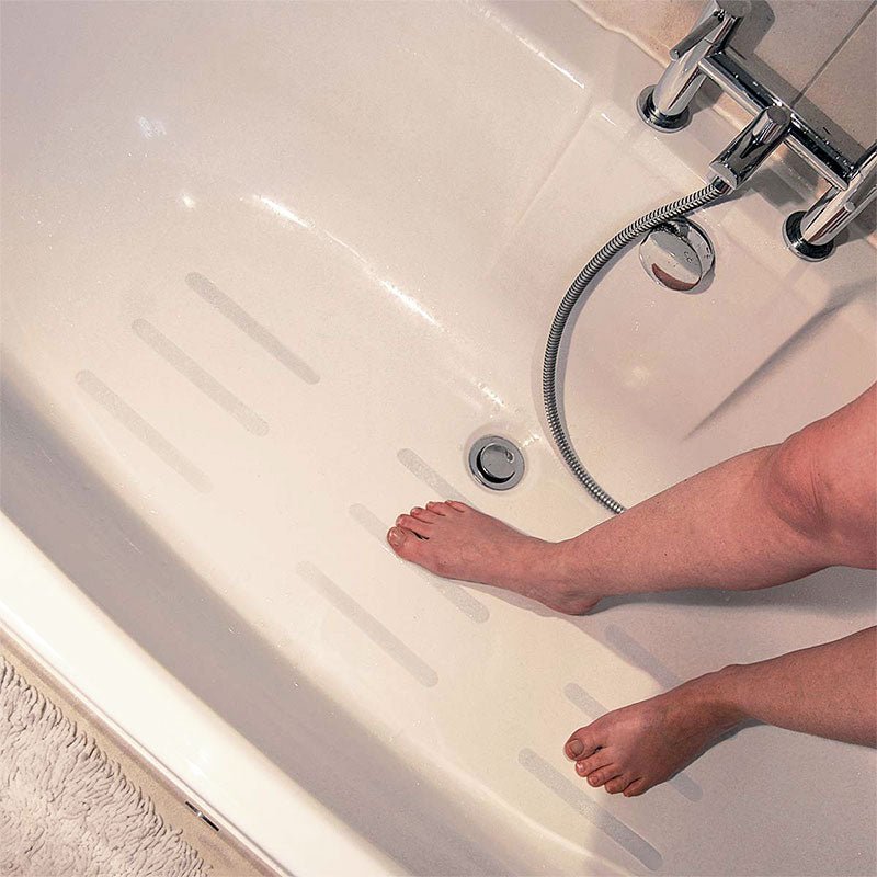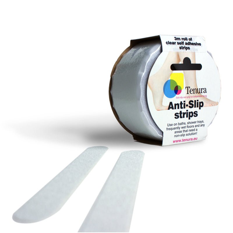 Halkskyddstejp från Tenura som kan anvämdas i dusch och badkar, men även på golvet i köket eller på trappor för att minska risken för fallolyckor. Halkskyddstejpen är enkel att fästa och är ett hygienisk alternativ till vanliga duschmattor.