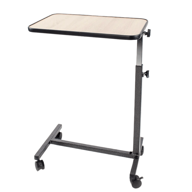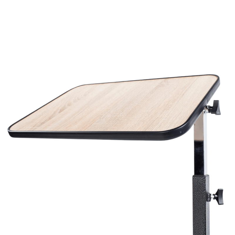 Praktiskt sängbord på fyra hjul som kan rullas in över sängen. Bordsskivan har rundade hörn och kan vinklas i flera positioner.