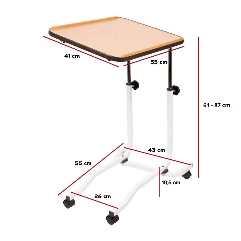Enkelt, allsidigt och användarvänliga sängbord med fyra hjul från Mobilex. Lätt att justera i höjden och att vinklas efter behov.