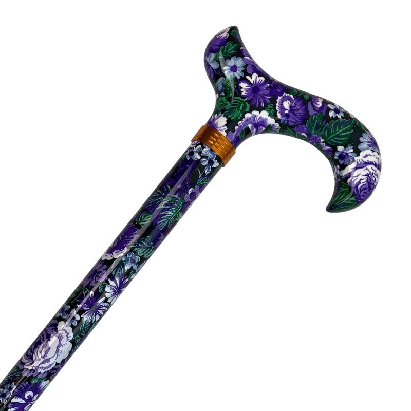 Damkäpp i fint blommigt mönster över hela käppen. Fin gyllene dekorativ ring mellan käpp och grepp. Käppen har lila och vita blommor med gröna blad som nästan helt täcker en svart bakgrund.