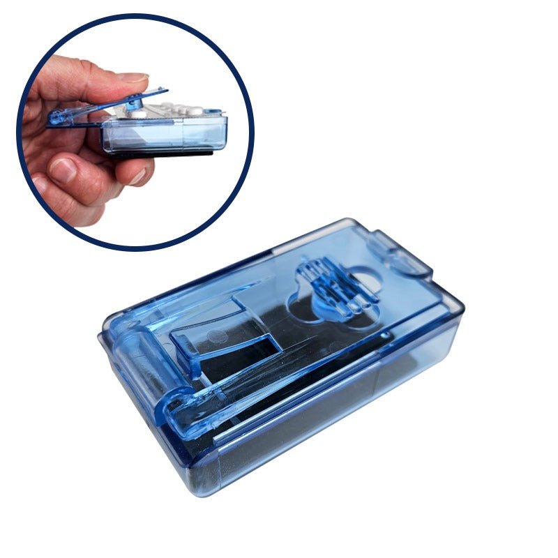 En tablettuttryckare är ett hjälpmedel för att trycka ut tabletter ur blisterförpackningar. Tablettutryckaren har en inbyggd uppsamlare som öppnas och töms när du har tryckt ut dina piller.