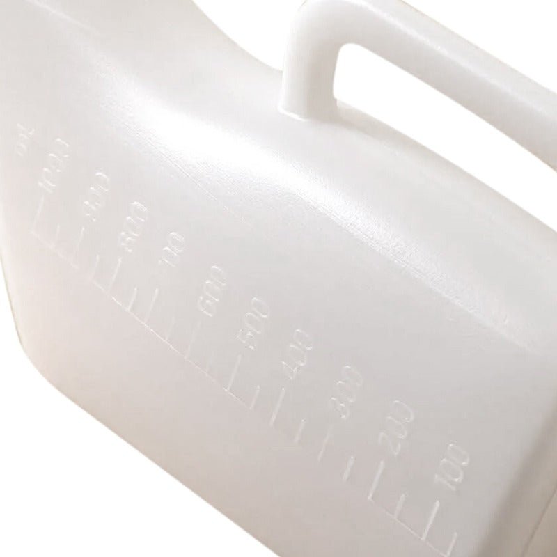 Urinflaskan är tillverkad av hård vit plast, har en kapacitet på 1 liter och har en mätning i ml på framsidan. Själva flaskan har ett praktiskt handtag på ovansidan och är platt på undersidan, så att den ligger stadigt. Öppningen har en diameter på 5 cm.