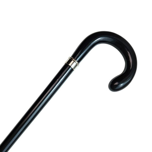 Klassisk promenadkäpp i trä med böjt handtag och en fin dekorativ silverring. Käppen är tillverkad i svartmålat bokträ. Handtaget är tillverkat i formstöpt akryl, som är bevämt att hålla i och ligger bra i handen.