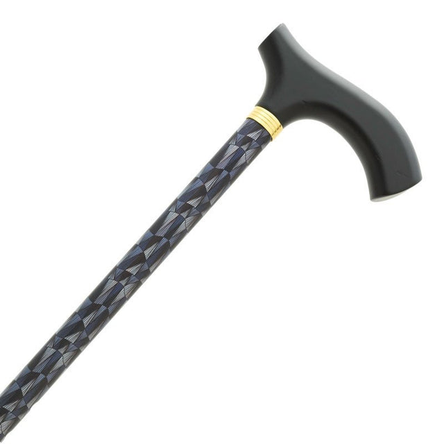 Elegant käpp i grå- och blåmönstrad metallook med fin metallring och svart derbygrepp. Käppen kan justeras i höjden, mellan 76-99 cm.