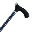Elegant käpp med rutigt mönster i svart/blå/silver och mjukt, svart grepp med silikon som är både behagligt och tryggt att hålla i. Mellan käppen och handtaget löper ett dekorativt band i silver.