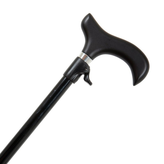 Denna svarta aluminiumkäpp med svart trähandtag och silverfärgad dekorring har en helt ny och smart höjdjustering. Med ett enkelt tryck på en vippknapp under handtaget kan käppen steglöst förlängas och anpassas exakt efter din längd och dina behov – och det krävs inga särskilda fingerkrafter.