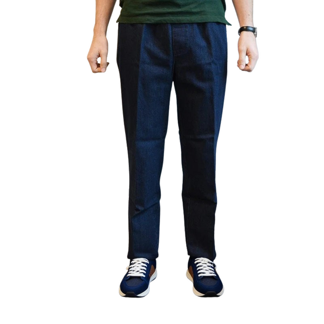 Komfortabla denimbyxor med extra höjd i byxdelen och resår i midjan.