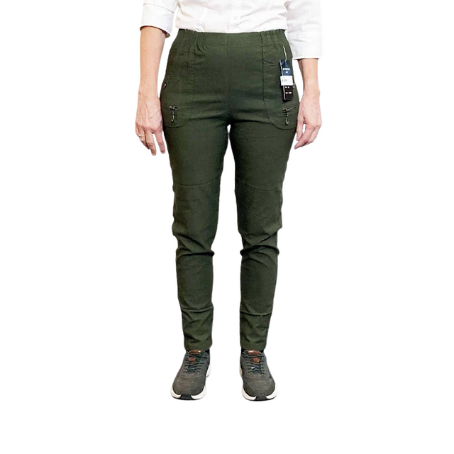 Snygga, bekväma byxor i en djup olivgrön färg, med fastsydd resårkant, som passar till de flesta kroppstyper.