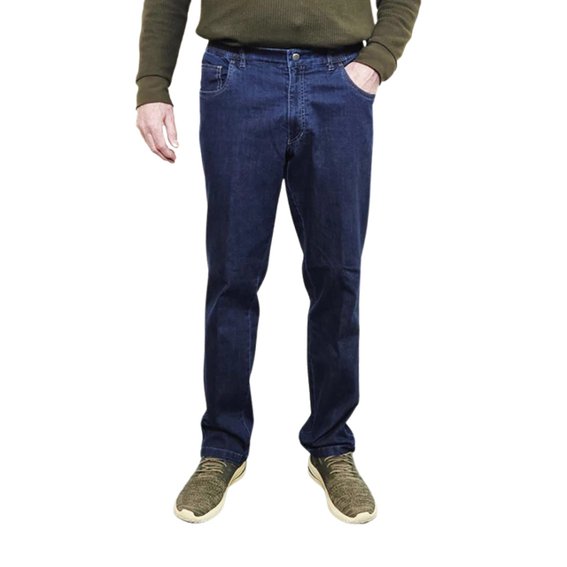 Superbekväma stretchjeans med elastisk linning i hög kvalitet från Luigi Morini. Byxorna har fina detaljer med dekorativa sömmar, hällor till skärp och fem fickor - två bakfickor med knappar, två sidofickor och en myntficka.