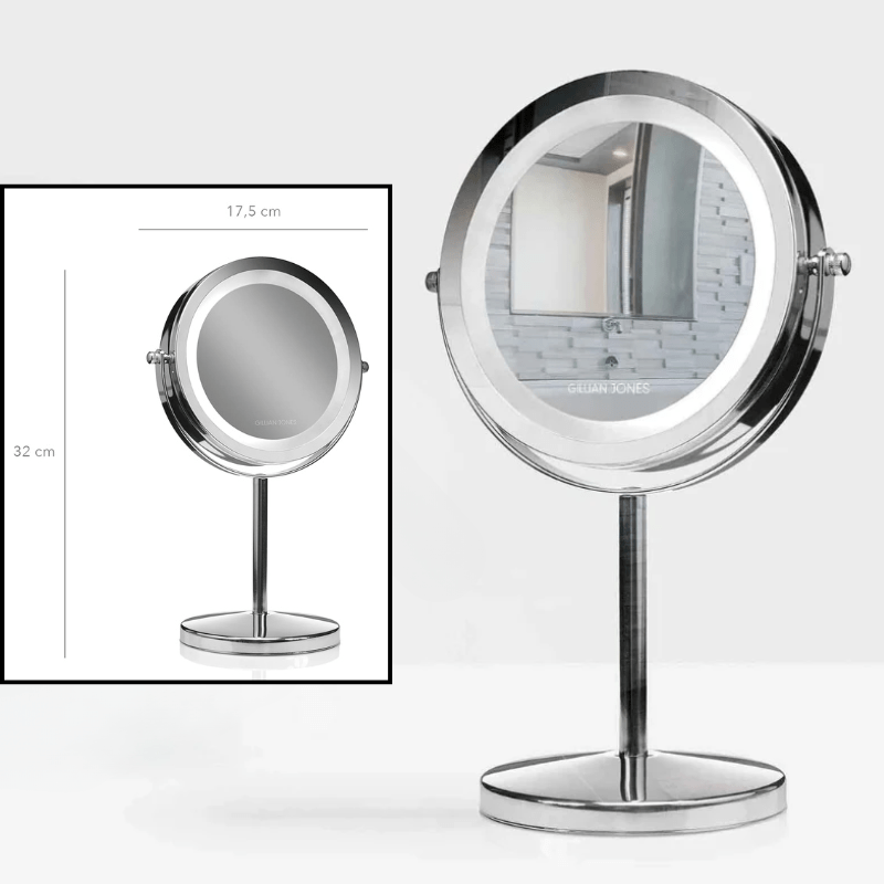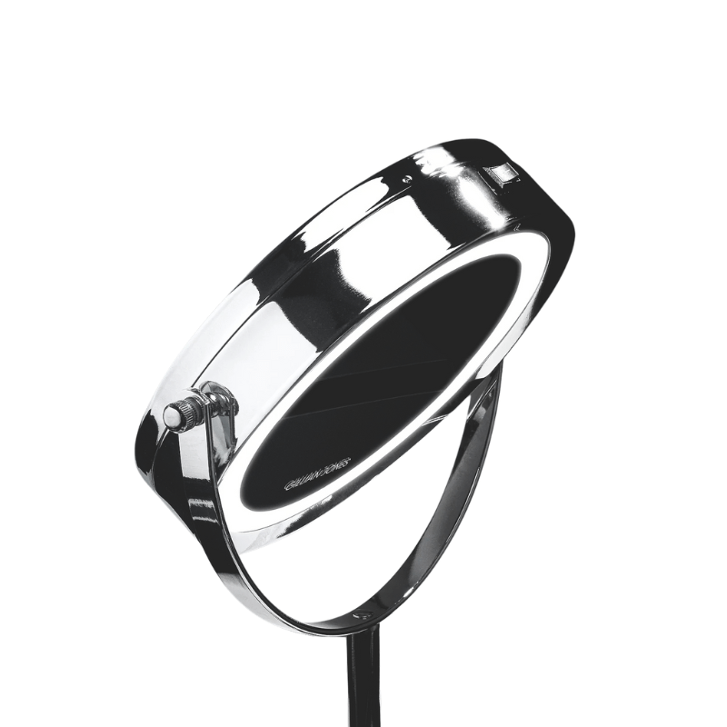 Smart och dekorativ sminkspegel med LED-ljus och lutningsfunktion på bas. Spegeln har två sidor som förstorar 1x respektive 10x – perfekt för att applicera exakt smink, noppa ögonbryn eller styla hår.