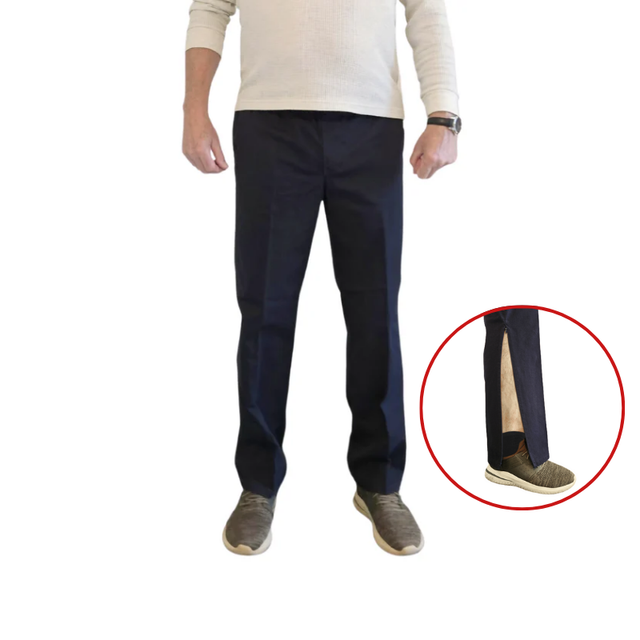 Det som gör denna modell helt unik är den dolda dragkedjan från knä till fot på varje sida, vilket gör det lättare att ta av och på byxorna – även med skor på – och samtidigt möjliggör användning över exempelvis gips eller benskena. Dragkedjan är diskret och syns inte när den är stängd.