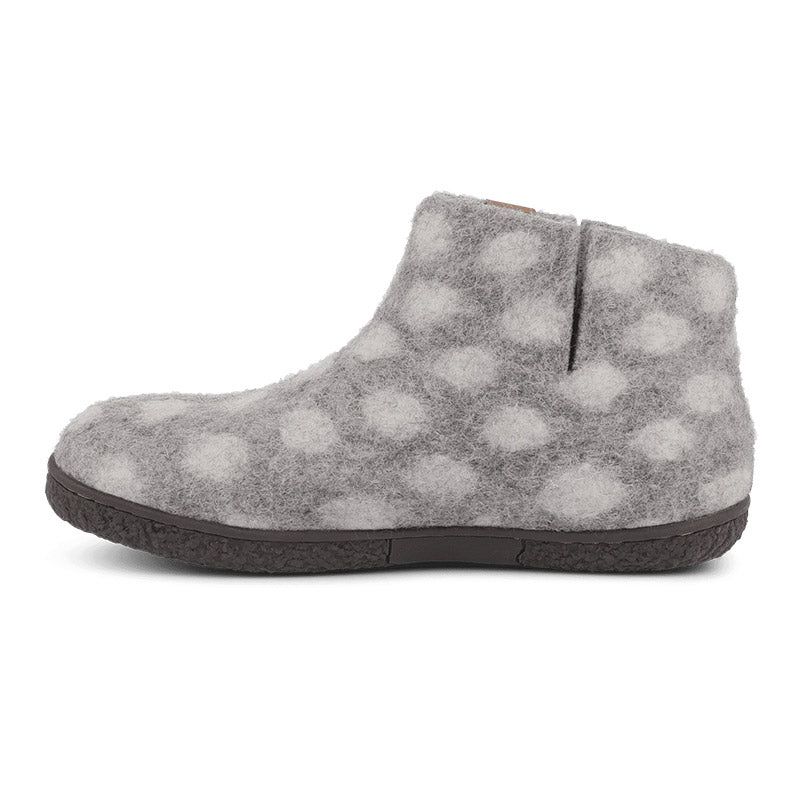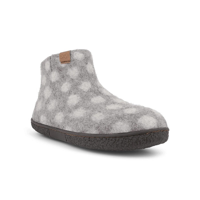 Handtovade grå ulltofflor med prickar och stötdämpande EnergySole från Green Comfort, som håller dina fötter varma och torra hela dagen.