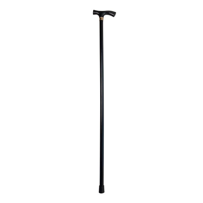 Den här käppen har en klassisk design som passar både damer och herrar. Den mäter 90 cm och är tillverkad i mörkt trä med en elegant guldfärgad metallring underhandtaget. Handtaget har en klassisk T-form och är lätt rundat och behagligt att hålla i.