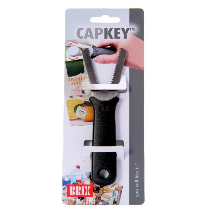 Den patenterade locköppnaren CapKey öppnar nästan alla slags flaskor och kartonger. Med den smarta krokodilnäbben kan man lätt greppa tag om både stora och små lock, sedan är det bara att vrida.