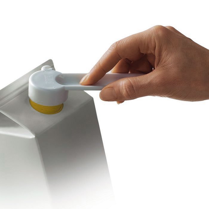 Många mjölk- och juice kartonger finns nu med skruvlock som kan vara svåra att lossa och skruva av. Här kan TurnKey skruvlocksöppnare hjälpa till.