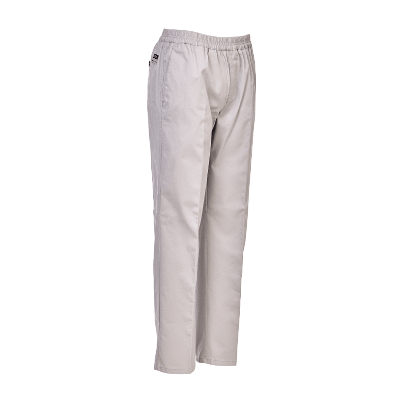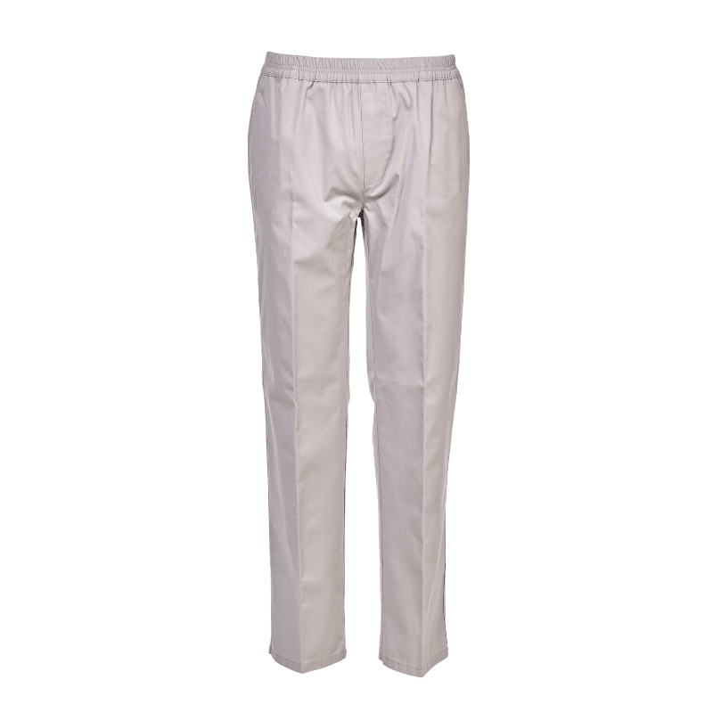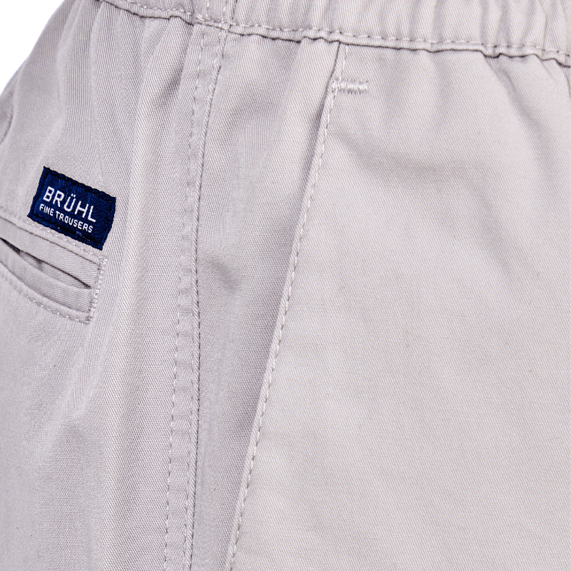 Tunna, klasiska byxor i ljusgrått, mjukt tyg från Brühl, med resår i midjan – utan knappar eller dragkedja. Byxorna har två djupa framfickor och en enkel bakficka med knappstängning.