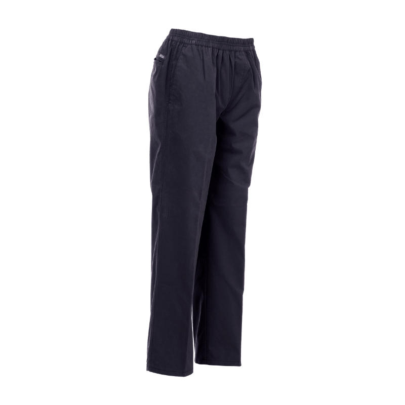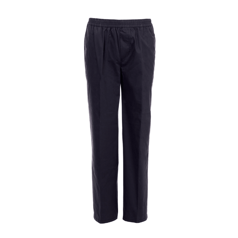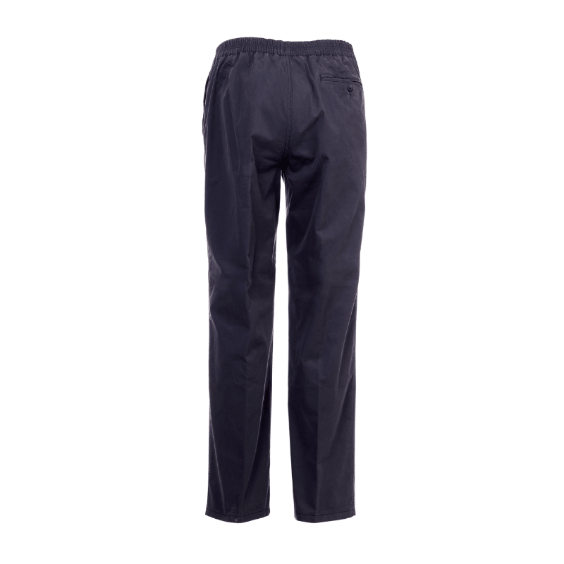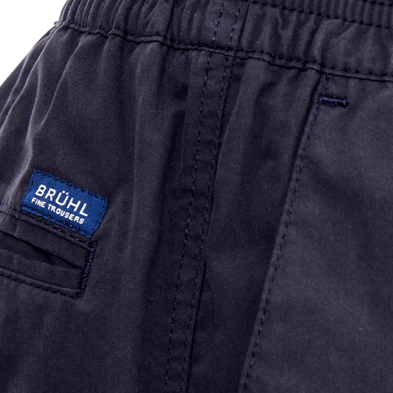 Tunna, klassiska byxor i marinblå färg i mjukt tyg från Brühl, med resår i midjan – utan knappar eller dragkedja. Byxorna har två djupa framfickor och en enkel bakficka med knappstängning.