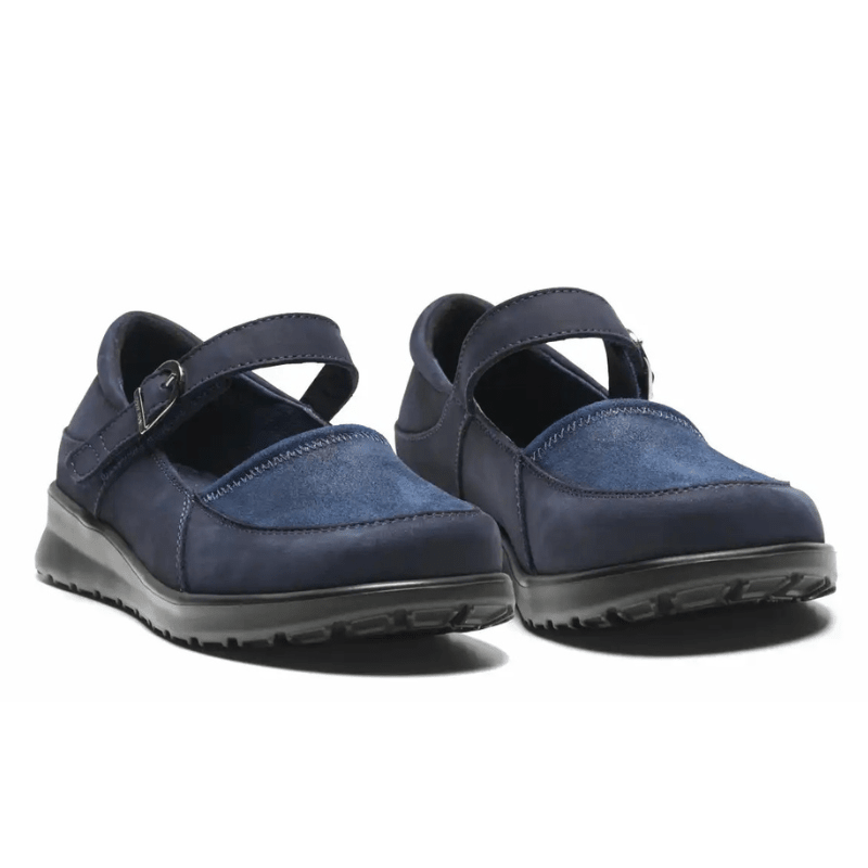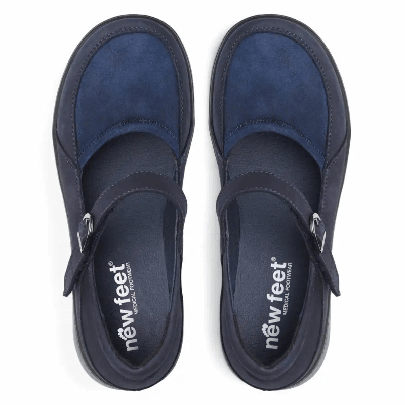 Mörkblå New Feet-ballerinasko i mjukt och naturligt läder med mockadetaljer, designad för att ge komfort hela dagen. Skon har ett smart stängningssystem med en kardborrerem över vristen som enkelt kan justeras för optimal passform.