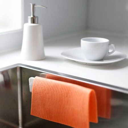 Denna smarta, praktiska hållare till disktrasan kan fästas på insidan av diskbänken med en stark sugkopp. Trasan är således placerad i diskhon och förvaras på ett hygieniskt och bekvämt sätt.