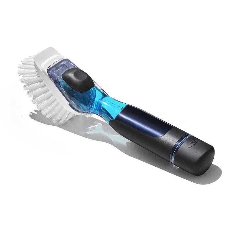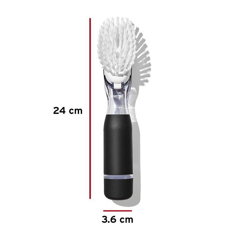 Borstens skaft fylls med diskmedel, och med ett enkelt tryck på en mjuk knapp tillförs en liten mängd tvål. Det är också möjligt att byta ut borsthuvudet när det behövs.