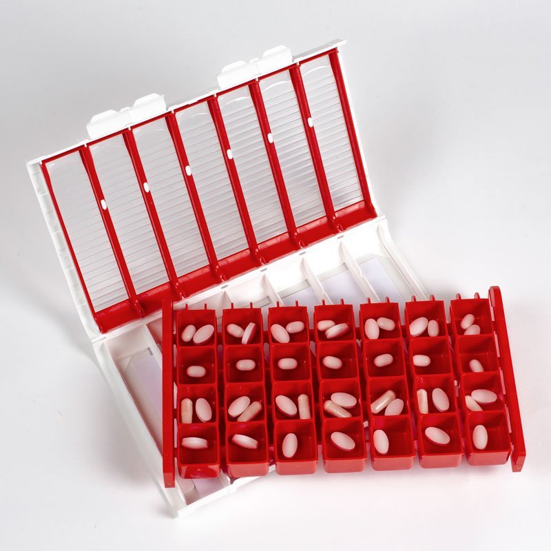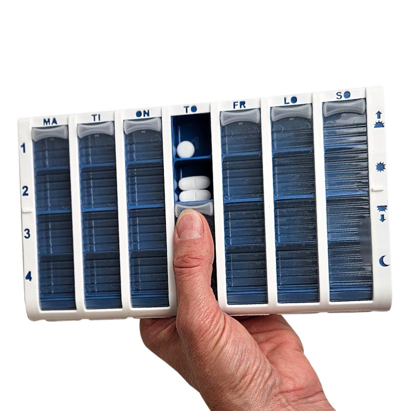 Dosetten har 7x4 fack, avsedda för en veckas dosering. Dagarna är tydligt markerade och de fyra facken är numrerade från 1-4. Tidpunkterna är markerade med symboler.