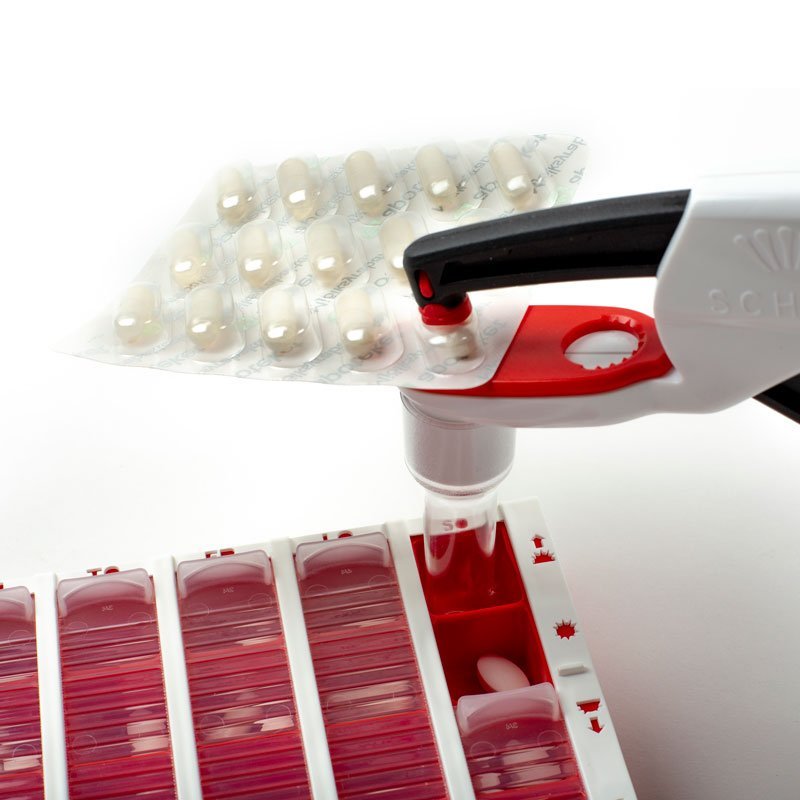 Pressa ut tabletterna ur förpackningen och kontrollera att tabletten hamnar i det önskade utrymmet via det transparenta, avtagbara röret på tablettuttryckaren. En både hygienisk och tidsbesparande hantering av tabletter.
