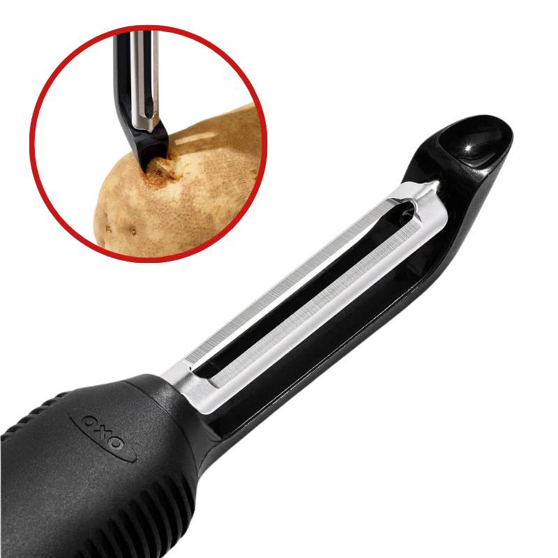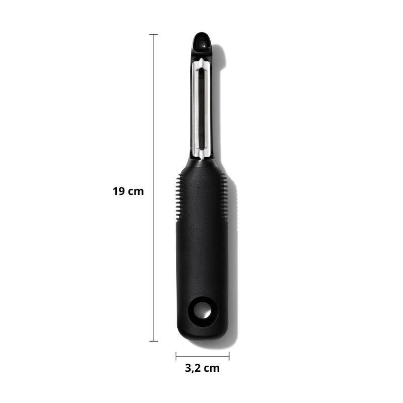 OXO Good Grips Swivel Peeler gör det enkelt att skala allt från potatis till äpplen. Dubbelbladiga blad i rostfritt stål följer råvarans form och ger en jämn och snabb skalning. Det mjuka, halkfria handtaget ligger säkert i handen, och den inbyggda urgröparen tar enkelt bort små fläckar.
