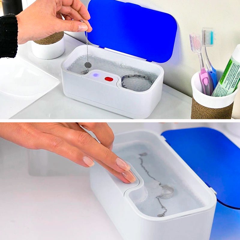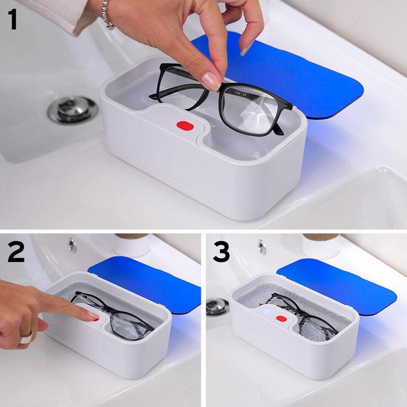 Med den här smarta, kompakta rengöraren kan du snabbt och enkelt rengöra dina glasögon eller smycken på bara några minuter. Damm och smuts avlägsnas skonsamt och effektivt med hjälp av små vibrationer som skapar mikroskopiska luftbubblor. Dessa tränger in i även de minsta sprickorna och lämnar dina glasögon och smycken rena och fria från bakterier.