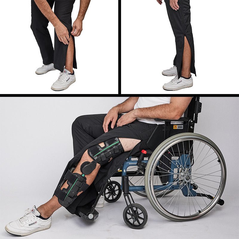 Byxorna har en genomgående dragkedja från midja till fot på båda sidor, vilket gör det extra lätt att ta dem av och på, samt ger plats för t.ex. gips eller benskena.