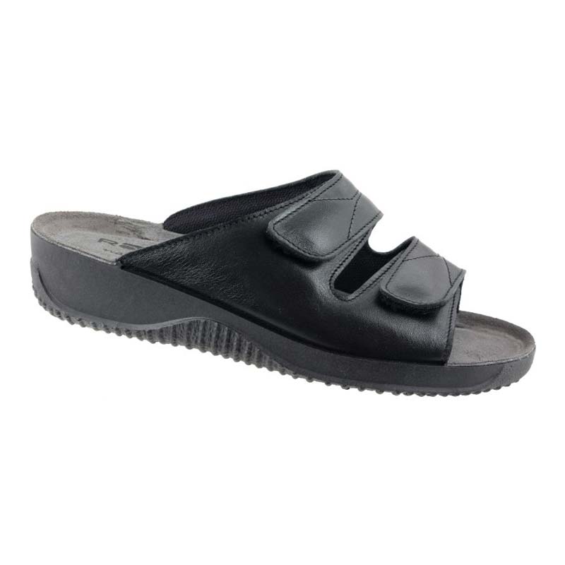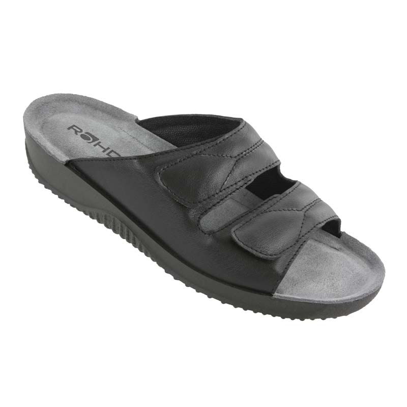 Bekväm sandal från Rohde i svart läder. En bra sommarsandal som också med fördel kan användas inomhus. Den har två remmar över foten som enkelt justeras med kardborreband.