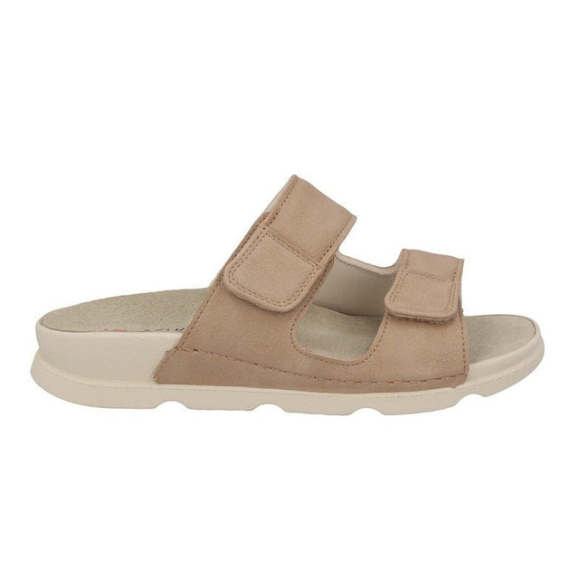 Mycket bekväm beige damesandal tillverkad av ekoläder, kombinerat med mycket mjuk stretch för extra flexibel passform. Sandalen har två kardborreremmar över vristen och är idealisk för personer med breda fötter eller fotbesvär, såsom Hallux Valgus, eller för personer som står mycket under dagen.