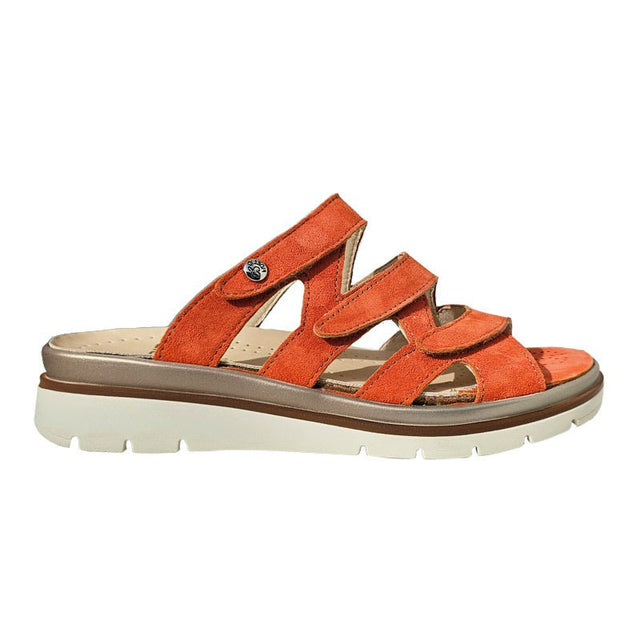 Superbekväm och rymlig damsandal från Fidelio i rostfärgad mocka med kardborreband. Sandalen är flexibel och lätt vadderad, vilket gör att den formar sig efter foten och minskar onödigt tryck på till exempel knölar.