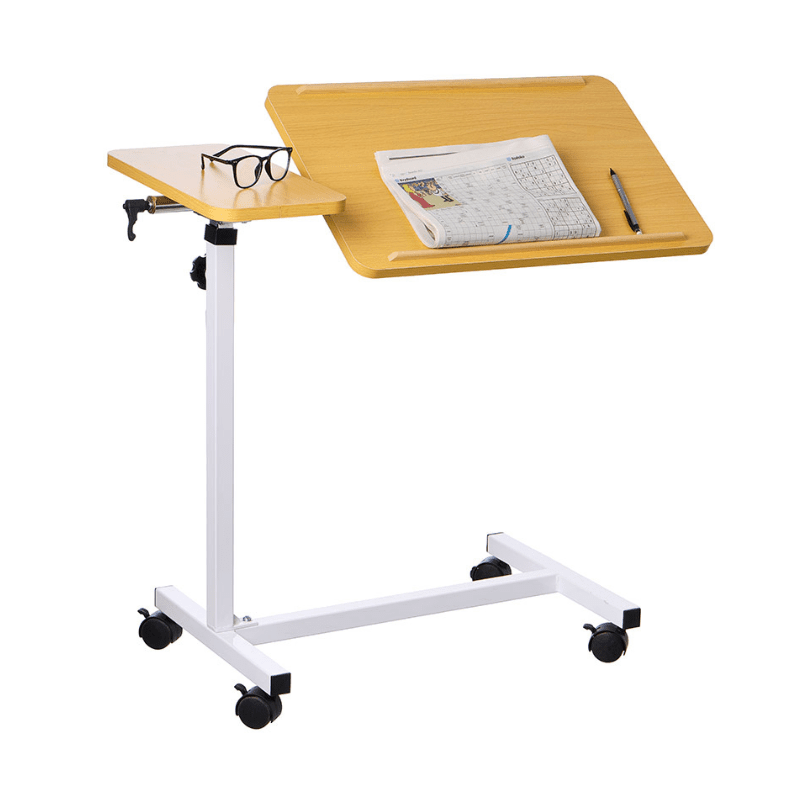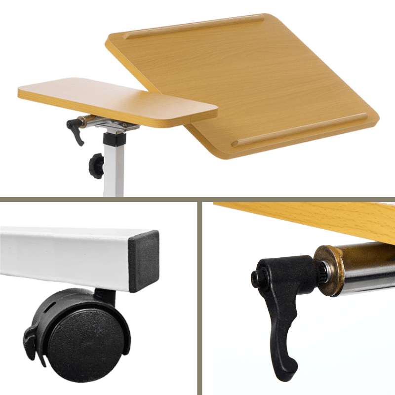 Detta flexibla sängbord är idealiskt för både sängen och rullstolen. Med 4 svängbara hjul (alla låsbara) kan bordet enkelt flyttas runt och placeras precis där du behöver det.