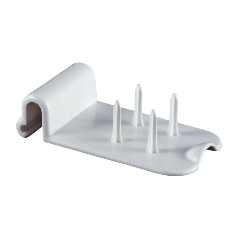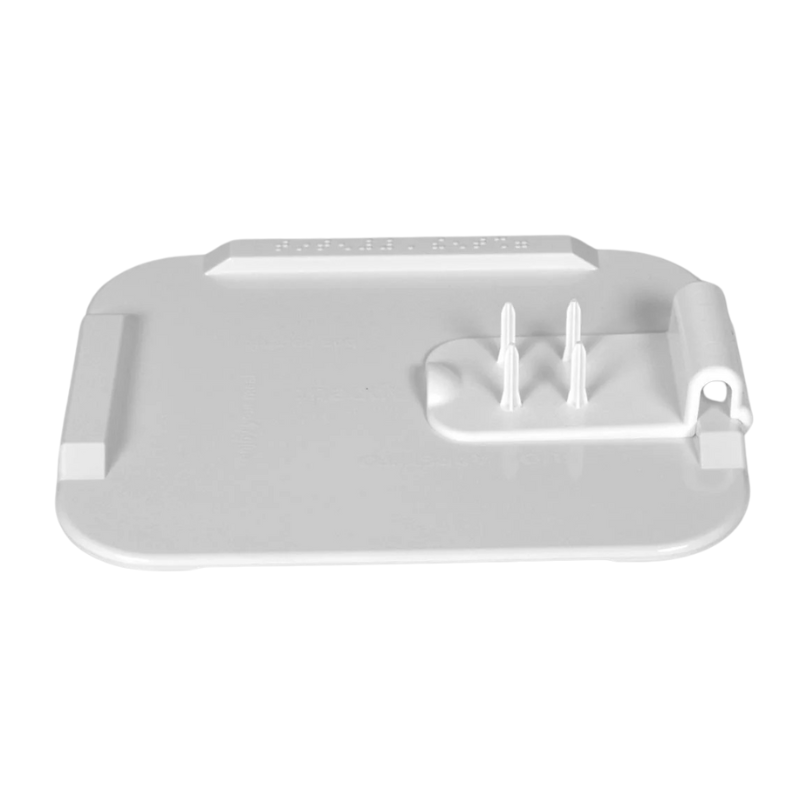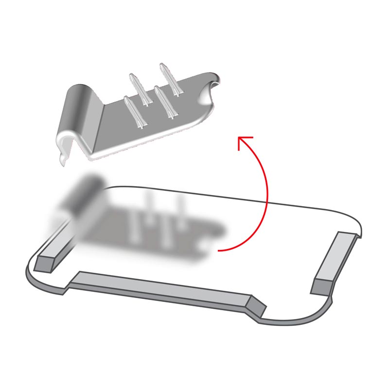 Klämman är utformad med spikar som håller fast förmålet. Du klickar enkelt fast klämman på en av brickans förhöjda kanter.