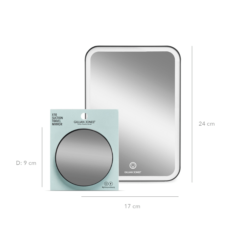 Som en extra gåva ingår en liten resespegel med 10x förstoring och sugkoppar, så att du enkelt kan fästa den på en slät yta. Den lilla spegeln är tillverkad av splittersäker plast och har en diameter på 9 cm.