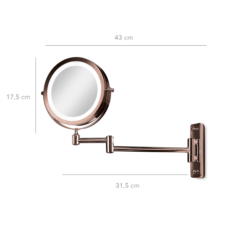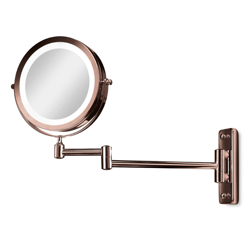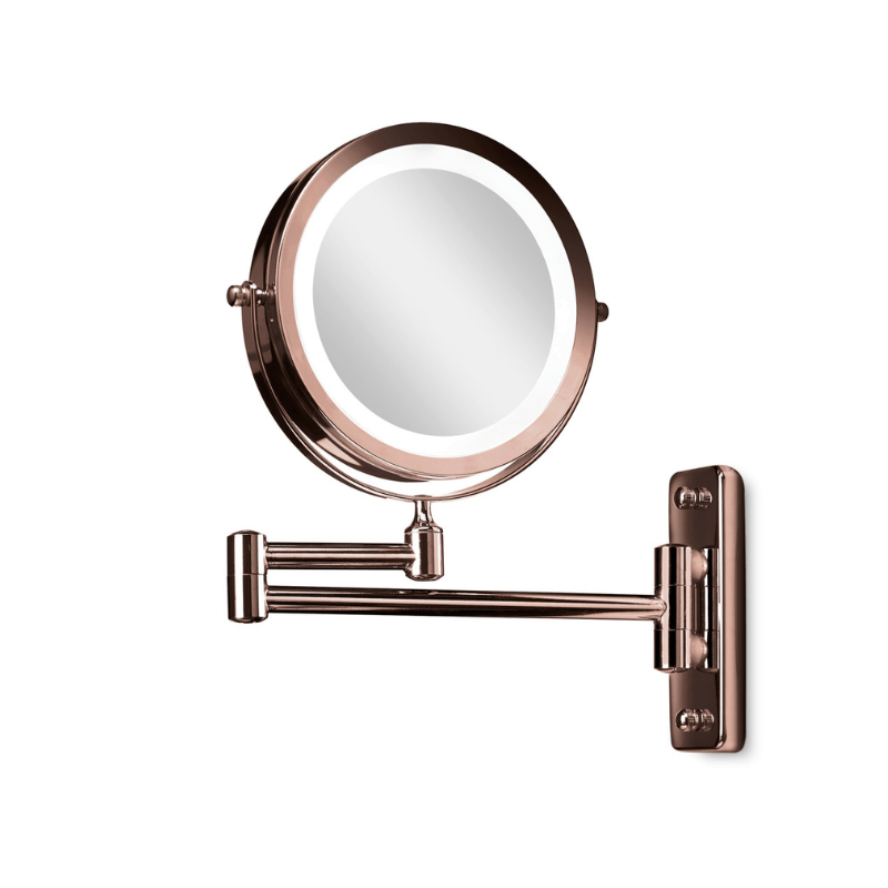 Vacker vägghängd sminkspegel i koppar med en dubbelsidig spegel som förstorar 1x på ena sidan och 10x på den andra. Spegeln har inbyggt ljus med små dioder runtom, så att du kan se varje detalj tydligt.