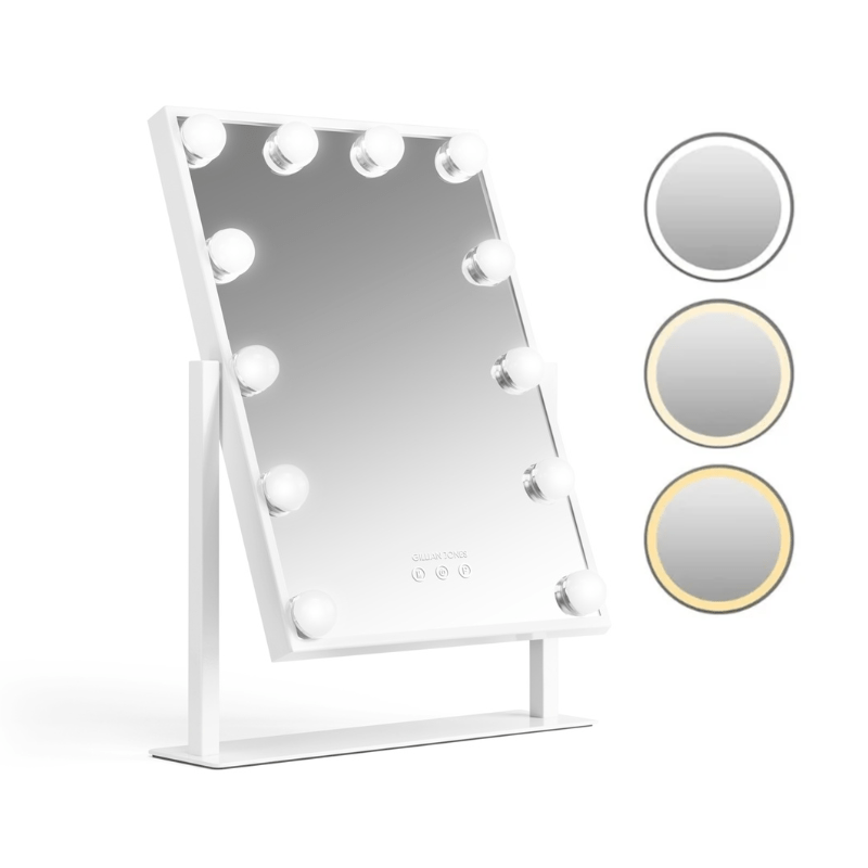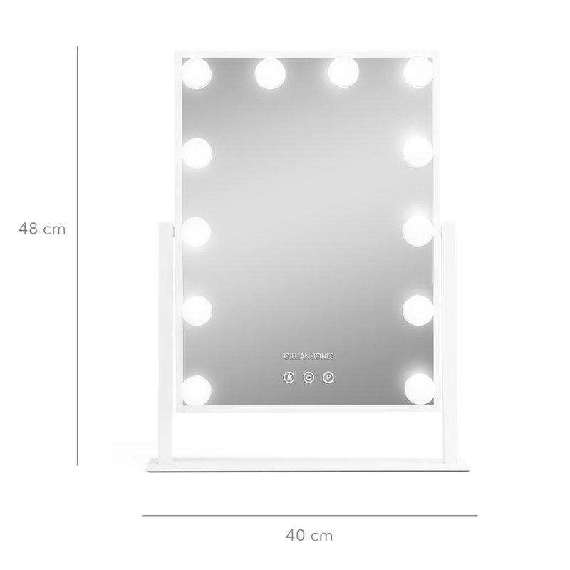 Få den perfekta uppsättningen för all din sminkning med denna snygga spegel från Gillian Jones. De 12 justerbara LED-lamporna ger dig professionell belysning, och med touchfunktionen kan du enkelt välja mellan kallt, neutralt och varmt ljus – beroende på dina behov.