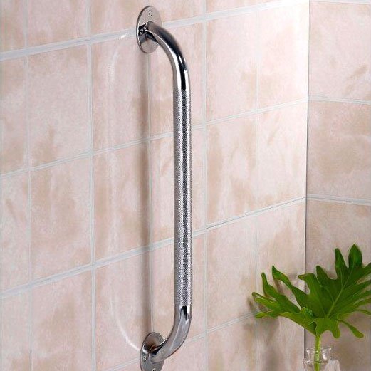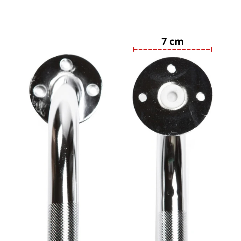 Handtag för badrummet som monteras direkt på väggen med skruvar. Handtaget är tillverkat i krom med mönstrad yta på mitten för att ge bättre grepp.
