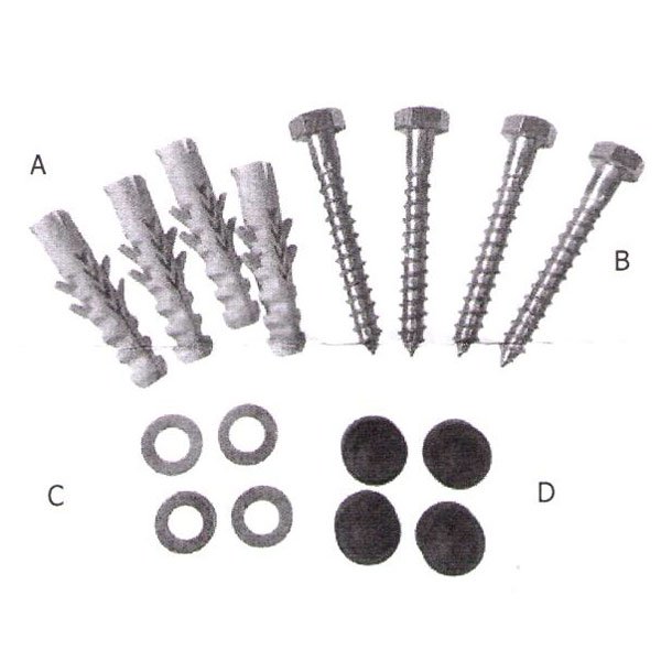 Monteringssats för stödbågar bestående av franska skruvar, rawplugs och svarta täckknappar - set om 4 st. Denna monteringssats används för att montera väggbåge på hårda väggar som exempelvis betong eller mur av god kvalitet.