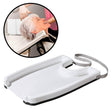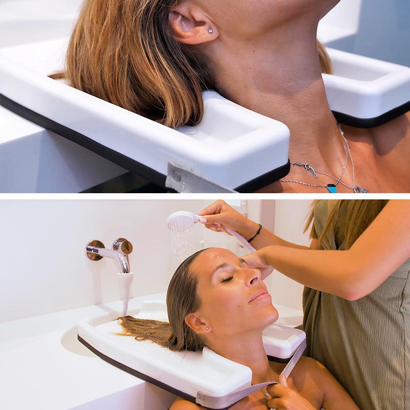 Smart, mobil hårtvättsbricka i kraftig stabil vit plast med svart kant och nylonband, för fastgöring till stol.